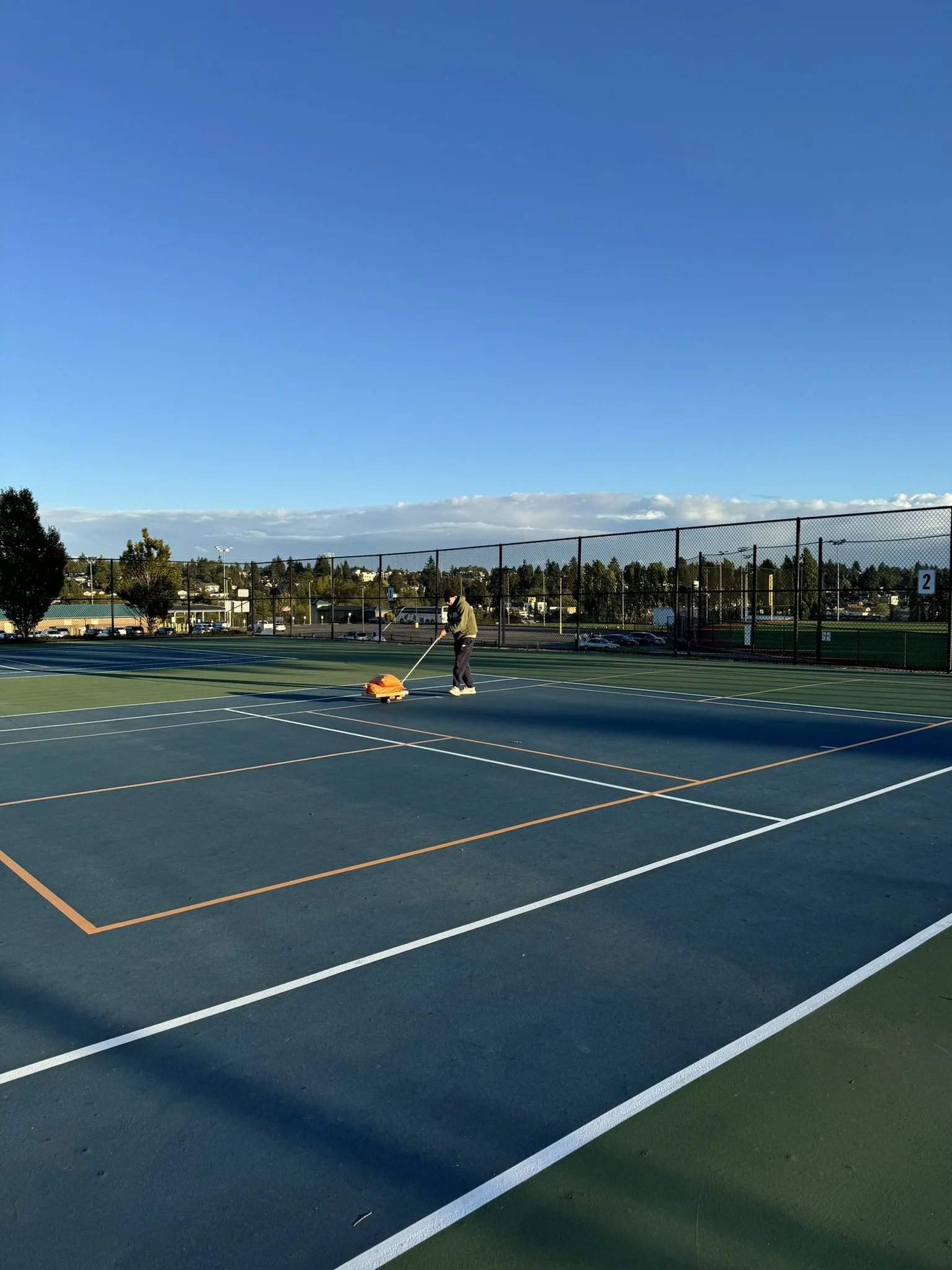 In teams of 2 per court, tape the sidelines, the baselines, the center line, and then the kitchen lines. In that order.